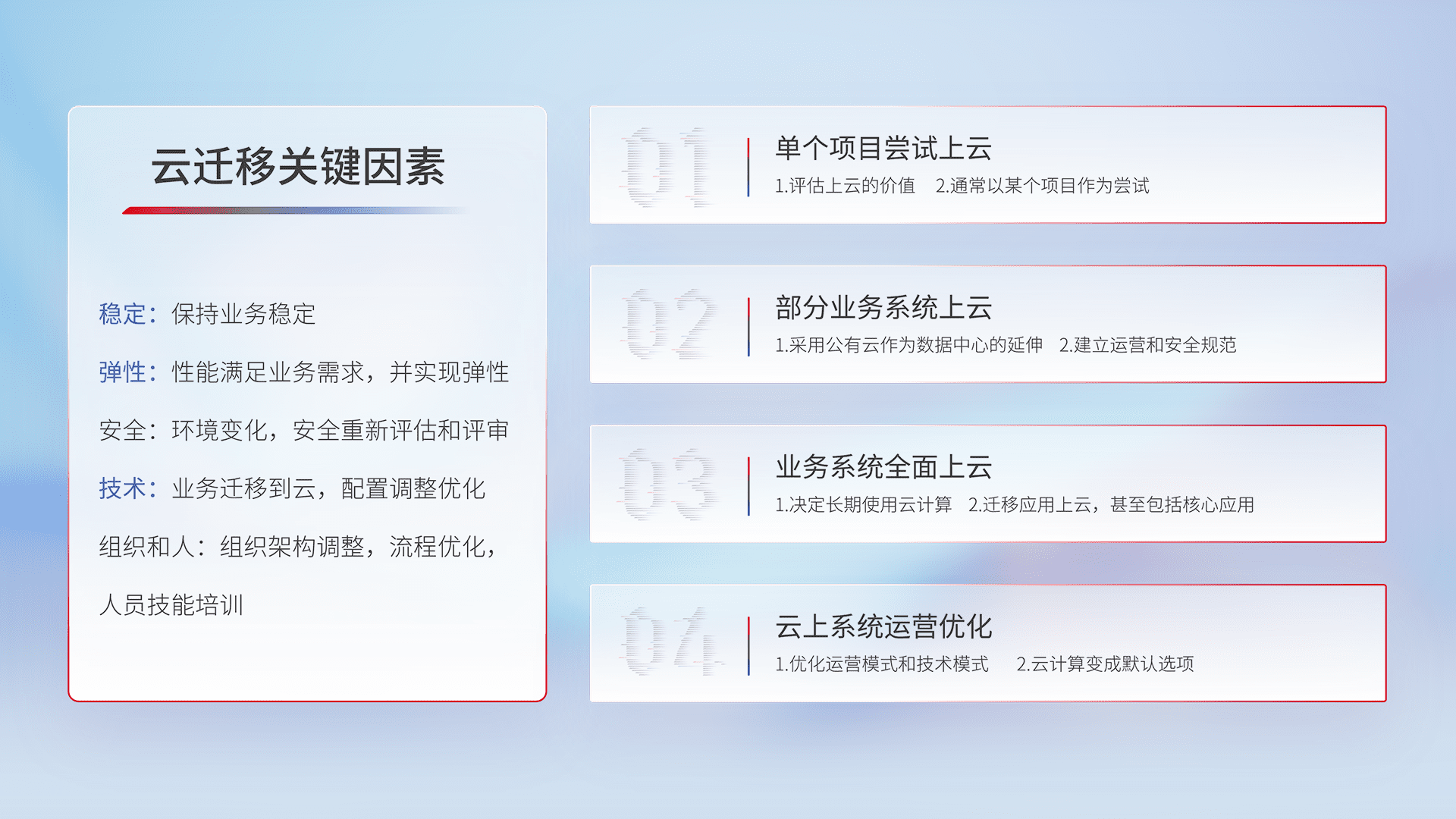 结合实际业务,,,从规划设计、、、云平台选型、、云原生改造、、数据迁移、、、、集成交付,,,迁移全过程为客户识别最佳上云路径,,,,做好风险识别管理,,,,设计网络架构、、身份权限、、安全审计合规、、、操作审计、、日志审计、、监控告警策略、、、、多站点容灾设计等,,对云上基础设施进行整体规划,,,提升IT治理水平,,,以满足弹性、、、、高可用、、、、高性能的需求。。。。
