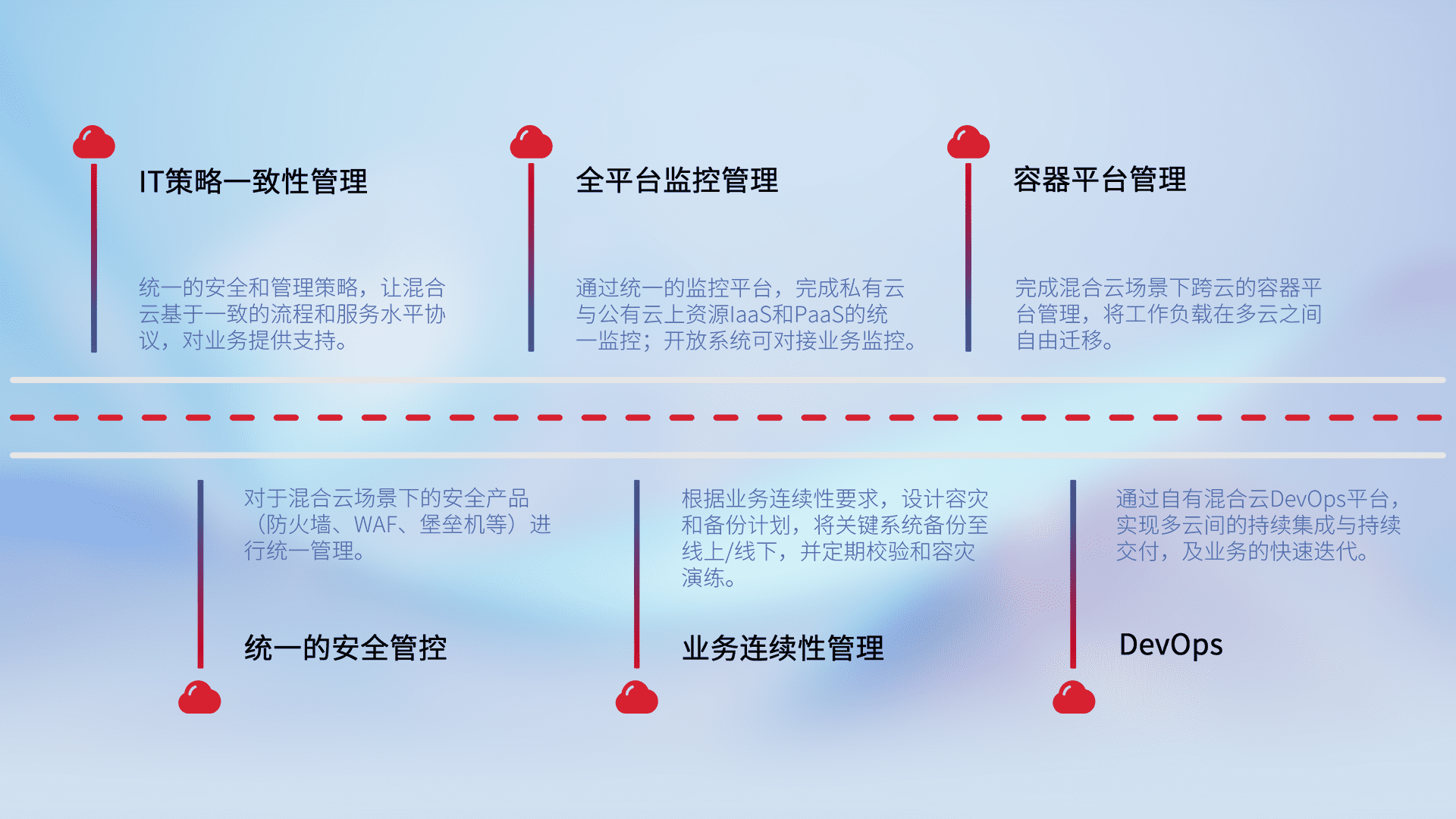 通过多云纳管,,,,以统一的资源数据模型把客户的云资源进行抽象和封装,,,,进而实现对多云资源的统一操作,,,,保障云资源管理的可靠性、、稳定性与可用性。。。。量身定制化运维内容,,配置、、、、开发运维、、、、补丁管理、、、备份、、、监控、、、、认证和访问管理、、、、审计和日常巡检等,,,,保障在用云过程中的可靠度,,,稳定度以及高可用率。。。。
