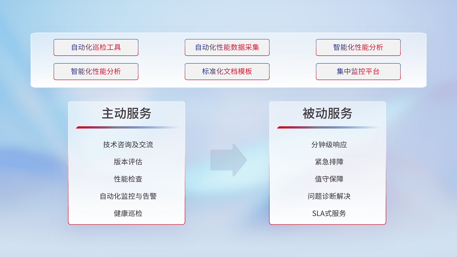 智能化工具和标准化文档,,,,保障服务质量,,,,提供主动服务(包含技术咨询、、、版本评估、、、、性能检查、、自动化监控与告警、、、、健康巡检)和被动服务包含(分钟级响应、、、、紧急排障、、、值守保障、、、、问题诊断解决、、、、SLA服务)。。